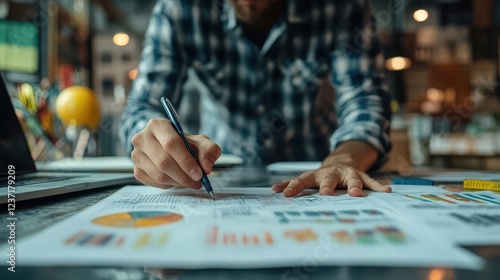 Entrepreneur working, close-up of hands sketching ideas, laptop in the background