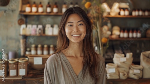 Entrepreneurial Asian woman discussing eco-friendly packaging solutions with customers, showcasing plastic-free options in her retail shop