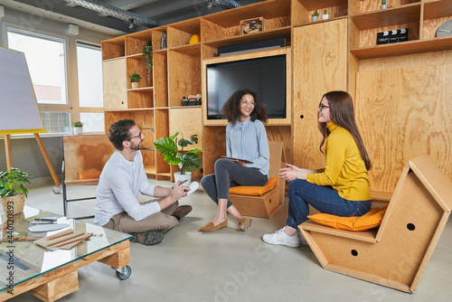 Entrepreneurs having discussion while working in creative office