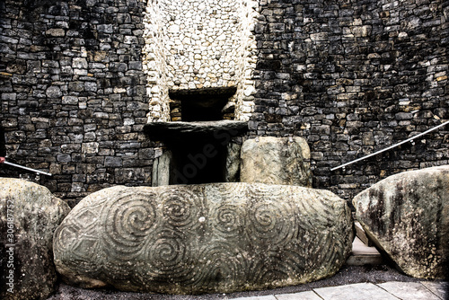 Entry of New grange passage tomb and stones carved with tri spiral pattern