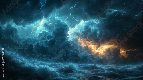 Epic Storm Cloudscape, Dramatic Sky with Lightning Strikes, Thunderstorm Over Ocean Waves