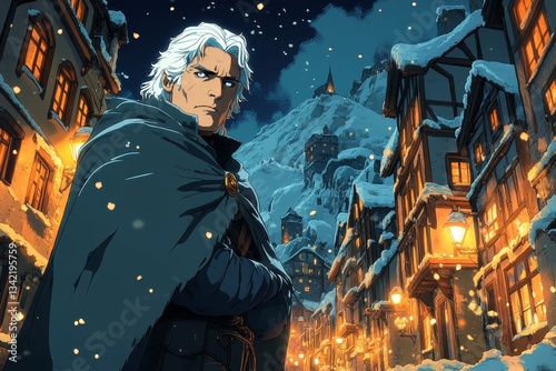 Epic Winter Adventure with Fantasy Hero: A Detailed Animation Illustration of a Magical Night Cityscape