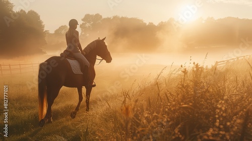 Equestrian enjoying a peaceful ride in morning light.