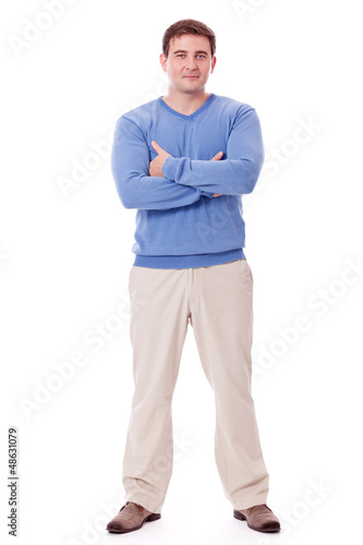 Erwachsener Mann in Freizeitkleidung mit blauem Pullover isolier