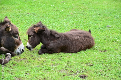 Esel oder Muli liegt mit Jungtier auf Gras, im Wildpark Knüll bei Homberg (Efze)