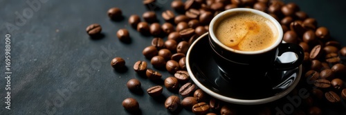 Espresso shot, coffee beans, black table, soft focus, top view, photography, intense, beverage