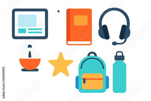 Essential school supplies including a backpack, book, and headphones arranged on a light background