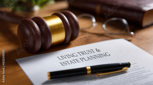 Estate law planning. Estate law planning document with pen and gavel on wooden desk showing careful legal preparation