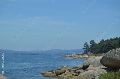 Estuary With Mussel Hatcheries In Its Interior In Arosa Island. Nature, Architecture, History, Travel. August 18, 2014. Isla De Arosa, Pontevedra, Galicia, Spain.