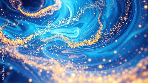 Ethereal abstraction features swirling blue and golden hues, strewn with glittering particles and celestial light trails, evoking a sense of cosmic wonder and mesmerizing beauty.