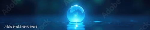 Ethereal bulb hovering above a still pool of blue water, blue hue, luminous orb