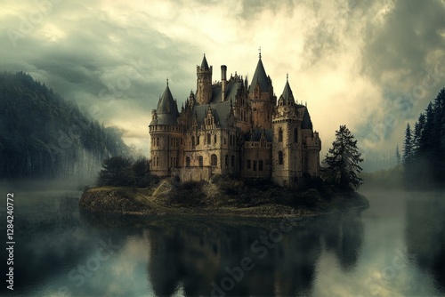 Ethereal Castle on a Misty Isle A Medieval Architectural Marvel Surrounded by Still Waters