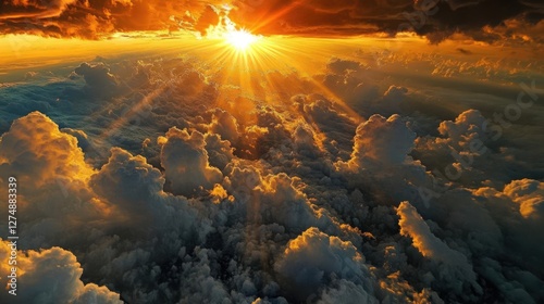 Ethereal Cloudscape With Dramatic Light Rays Breaking Through Majestic Cumulus Formations At Golden Hour