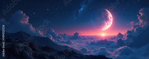 Ethereal glow of a crescent moon illuminating a celestial landscape, stars twinkling in a vast, dark universe Perfect for fantasy, sci-fi, or mystical themes , space, sky