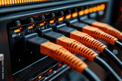 Ethernet cables with orange and black connectors plugged into a server representing network connectivity and organized data management in IT systems