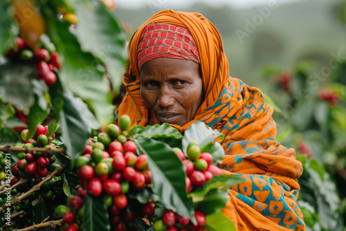 Ethiopian woman picking coffee from a coffee bush.