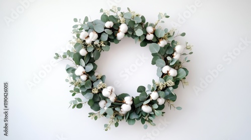 Eucalyptus and cotton floral wreath in an asymmetrical layout, soft natural greenery and white fibers, airy elegance on white