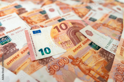 Euro banknotes surrounded by Russian rubles. Economy of Russia during european sanctions, exchange rate