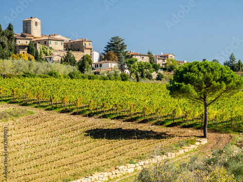 Europe, Italy, Chianti. Tuscan homes in the town of Panzano with vineyard below.