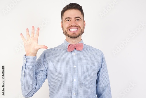 European man dressed in formal shirt and bow tie poses against white studio background showing and pointing up with fingers number five while smiling confident and happy.