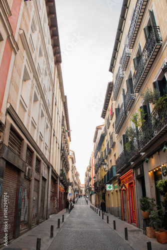 European narrow street with historic balconies, free on dry cloudy clear sky day