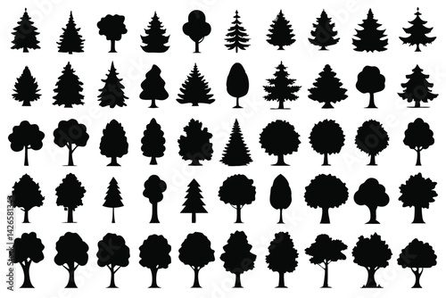 Even More Ultimate Tree collection, 100 detailed, different tree vectors. Evergreen forest firs and spruces black shapes, wild nature trees templates. Vector illustration woodland trees set.
