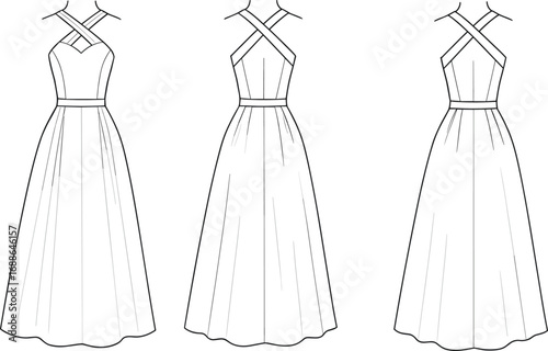 Evening dress fashion flat, halter neck gown, cross strap dress, technical sketch, sewing pattern, vector apparel design