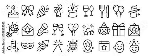 Event planning, party, and celebration outline icons set editable stroke isolated on white background. Vector illustration, birthday party, holiday, event icon, celebration icons, png.