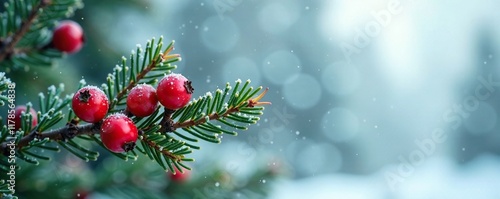 Evergreen branch with red berries against a snowy background, frosty, greenery