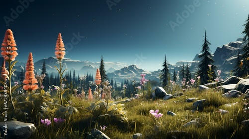 Evergreen flowers and grass field in nature