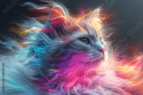 Evil Cat Sorcerer: Lightning Spell, Thundercloud, Windy Hair - Fantasy Magic Digital Art