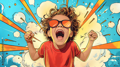 Excited boy with curly hair and sunglasses shouting triumphantly against a vibrant, explosive background.