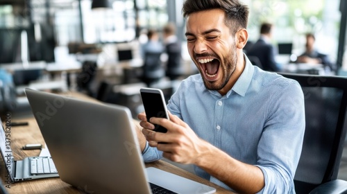 Excited Businessman Celebrating Success on Smartphone in Modern Office
