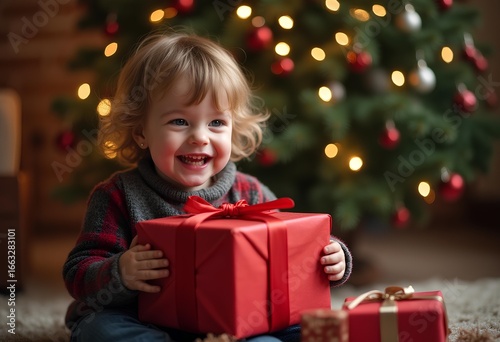 Excited toddler holding Christmas gift by tree