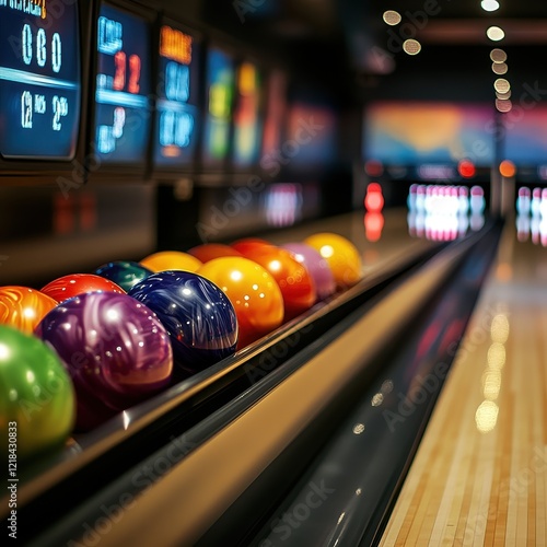 Exciting Bowling Event Modern Bowling Alley Digital Scoreboard Vibrant Environment Close-Up Sports Concept