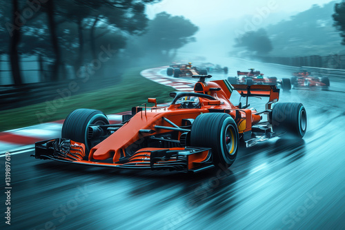 Exciting race cars speeding through a wet circuit during a competitive Formula event