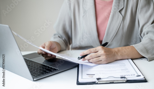 Executive CEO businesswoman checking job applicant documents resumes, interviews, and signing to approve the contract in the office room