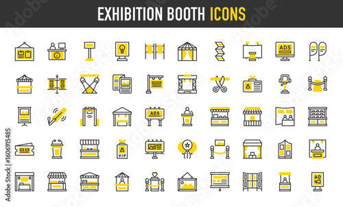 Exhibition booth vector icons. Booth, Exhibitor, Stand, Snack Booth, Pop, Spotlights, Billboard, Information, Opening Ceremony, Bow Flags, Speech, Brochure, Light illustration.