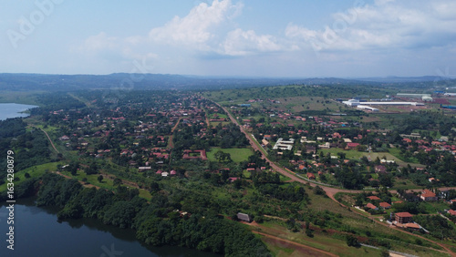 Expansive Aerial View of Suburban Landscape with Lake, Lush Greenery, and Scattered Buildings Under a Sunny Sky