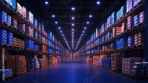 Expansive distribution warehouse interior illuminated by industrial lighting array