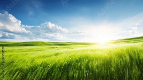 Expansive green field under a bright blue sky with fluffy clouds and a glowing sun in the background