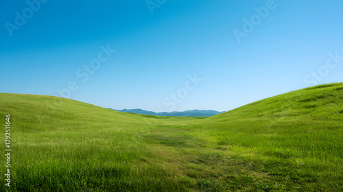 Expansive green hills under a clear blue sky with distant mountains creating a serene landscape