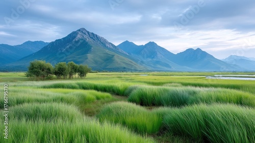 Expansive Lush Green Rice Paddy Field Under a Cloudy Sky with Majestic Mountains in the Background and Scattered Trees