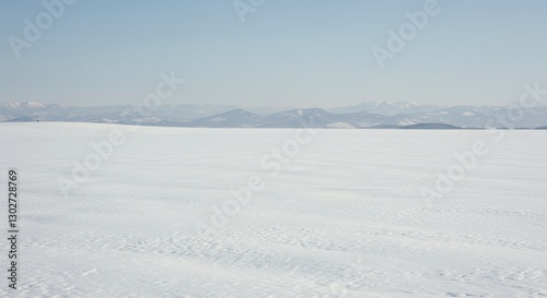 Expansive snowy landscape with distant mountains under a soft blue sky