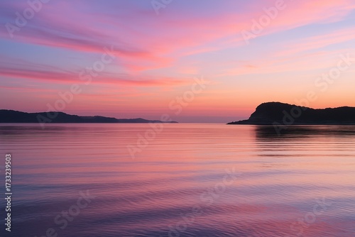 Expansive sunset panorama with glowing clouds over calm water and distant shore
