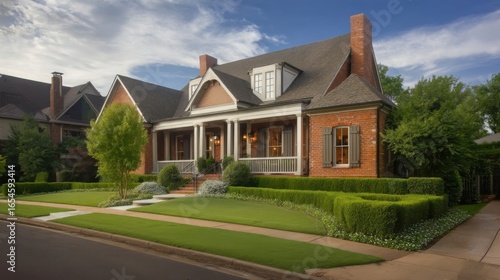 Expansive two-story residential house with red brick walls, white trim, dormer windows, gable roofs, prominent portico,