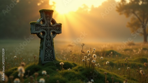 Experience a peaceful St. Patrick's Day morning as a mossy Celtic Cross, tilted by time, emerges from an overgrown field touched by gentle golden sunlight.