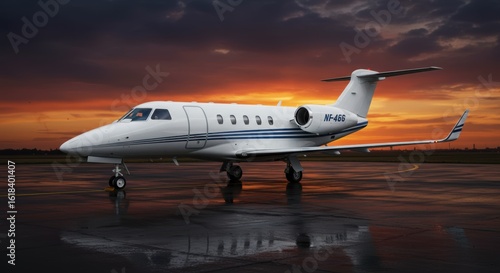 Experience luxurious travel with a stunning private jet against a dramatic sunset reflecting on the wet tarmac
