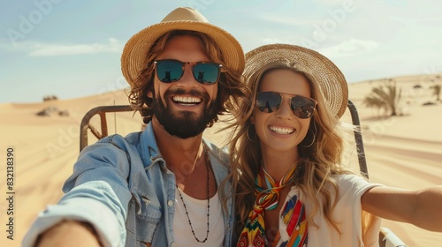 Experience ultimate joy with this young couple on an off-road adventure in the desert. Capturing memories with a selfie, discover the essence of summertime holidays and tourism tour activities.