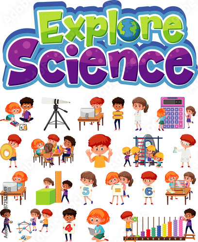 Explore science logo and set of children with education objects isolated